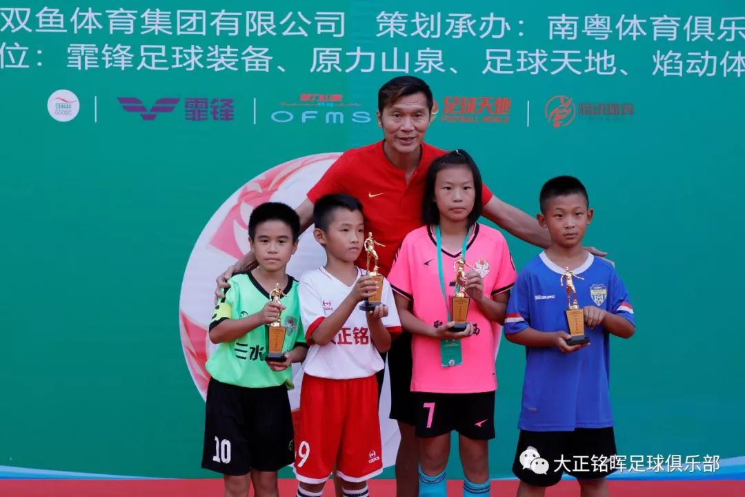 广东足球名宿,前中国国家足球队队长池明华对U8男子组、U9男子组、U11男子组、U10女子组的最佳运动员颁发奖杯,并合影留念。