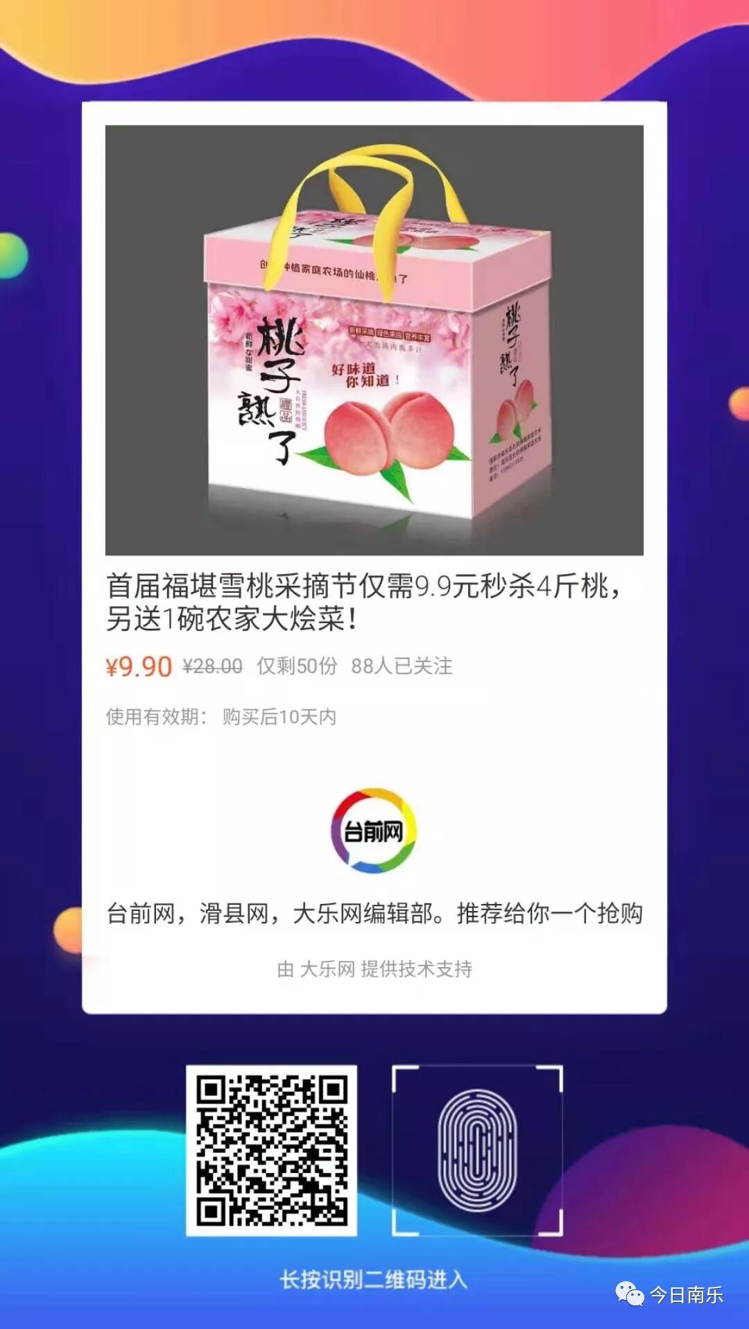 现在秒杀9.9元送4斤桃,19、20日当天送农家大烩菜一碗