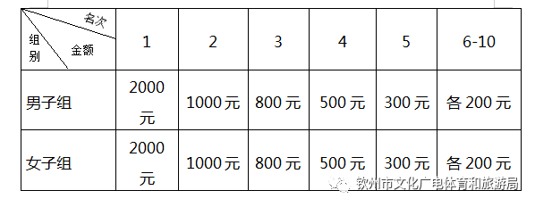 (1)男、女前十名均颁发奖金人民币(含税),并且前3名还会各颁发奖杯一座、奖牌一枚。具体见下表: