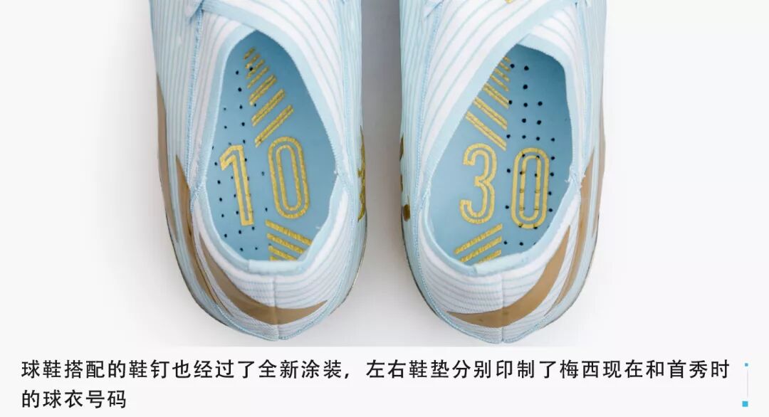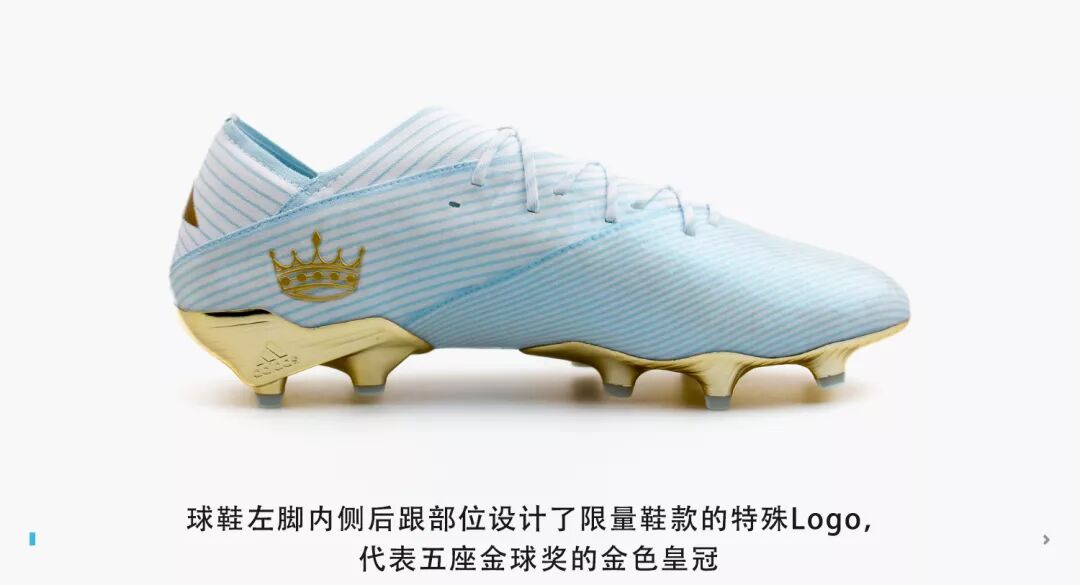 外观Nemeziz Messi 19.1 15Y限量版足球鞋的外观设计非常有特点,鞋面采用向梅西祖国致敬的白色与蓝色,分离式大底以及鞋面上的阿迪达斯胜利三条纹则用金色装饰,象征梅西在其职业生涯中赢得的无数奖杯。球鞋左脚内侧拥有一个带有五点的皇冠图案,代表其赢得的五个金球奖,右脚后跟内侧则是梅西个人专属标识。整个外观清新、华丽,好看又不会过于奢华,非常适合梅西。