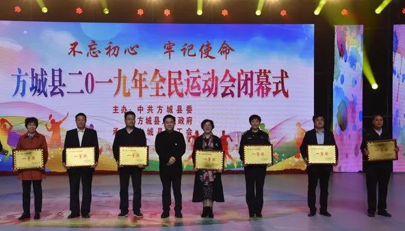 1方城县2019年全民运动会闭幕运动提升全民素质,健康推动改革发展。10月23日晚,方城县体育馆内灯光璀璨,欢歌笑语,方城县2019年全民运动会经过12天的激烈角逐,圆满完成各项赛事,胜利闭幕!运动会期间,来自全县57支代表队,2450余名运动员和工作人员积极参与,奋力拼搏,赛出了水平,赛出了友谊,取得了可喜可贺的成绩,也彰显出了裕州儿女的精神风貌。闭幕式上,宣读了各个赛事各个奖项的获奖名单,县领导褚清黎、段文汉、毕新民等现场依次为获得奖项的个人、集体颁发了证书、奖牌和奖杯。