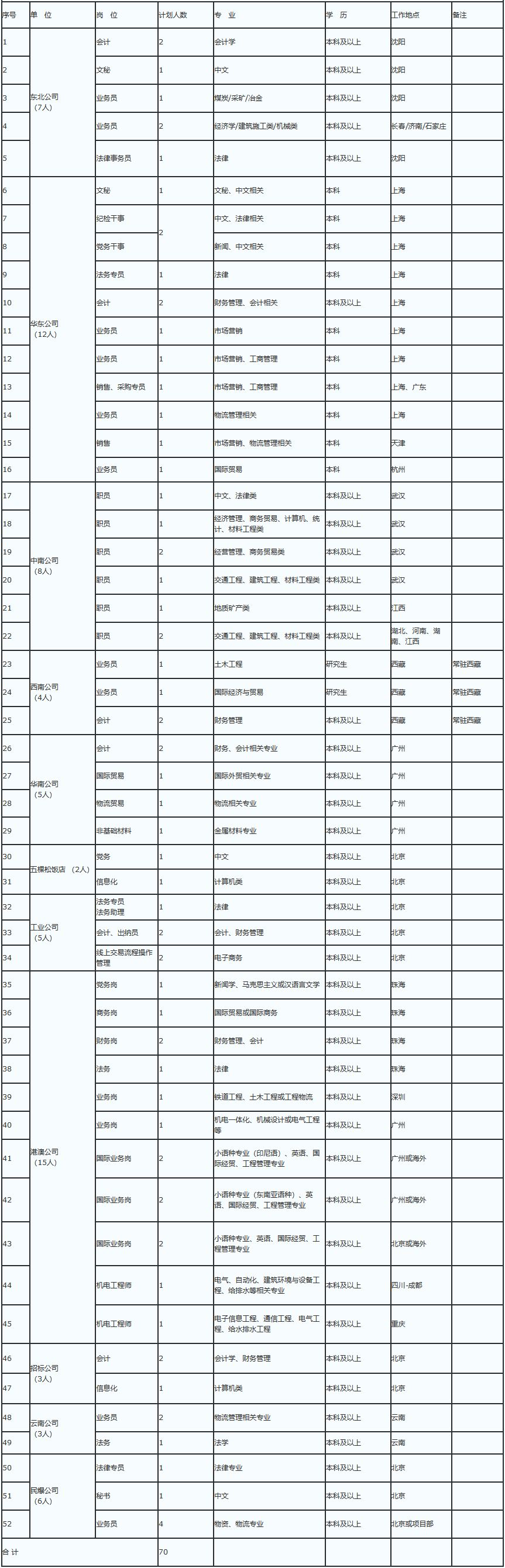 物资(流)管理、市场营销、企业管理、机电机械、电气工程、电子商务、国际贸易、外语、土木工程、工程管理、财务会计、中文、文秘、法律、采矿、计算机应用等(详见招聘计划表)