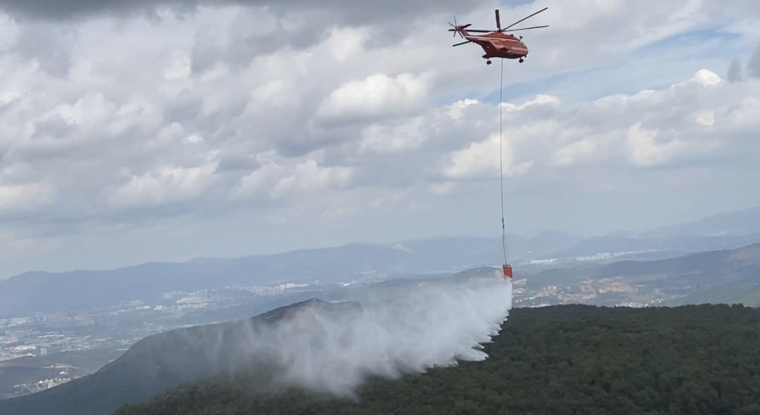 吊桶式灭火:云南大部分地区处于高原,受地形地势影响,在平原地区,直升机可提吊3吨水源,而在云南的高原地区,只能拉到1.5吨到2吨。云南很多林区树高达20米,利用直升机绳长40米的吊桶,保证在没有足够降落空间的时候可利用吊桶就近取水、扑火。