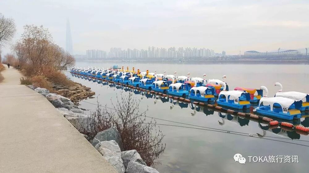 来雪橇场除了享受冬季运动的乐趣,也不要错过美丽的汉江景色。黄昏时分,沿着江边小路慢慢往前走,会看到可爱的小鸭造型水上出租车,还可以遥望对岸的乐天世界塔。这时的乐天世界塔渐渐亮起灯光,配上日落余暇,醉人的汉江美景就展开在眼前。