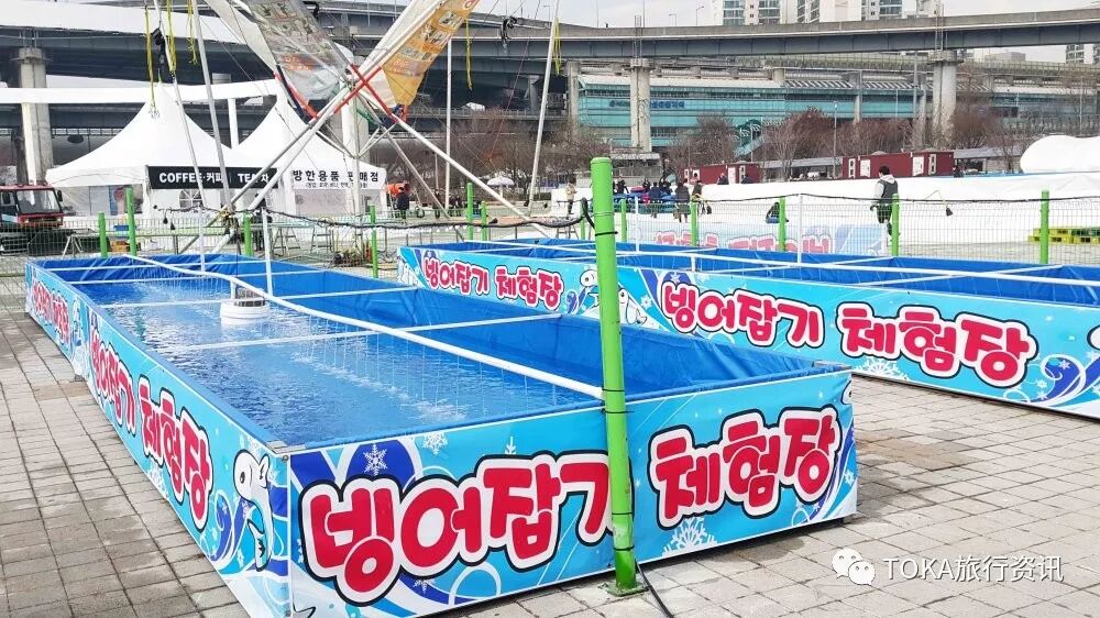 船、弹跳床等游戏设施,价格为3,000至5,000韩元。每到冬天,江原道华川就会举办钓冰鱼庆典,不能参加又想体验抓冰鱼的乐趣,不妨来试试!这是小记者第一次看到这种叫冰鱼的生物,小小一只却游得很快。到底要怎么抓?这还真的大伤脑筋呢。