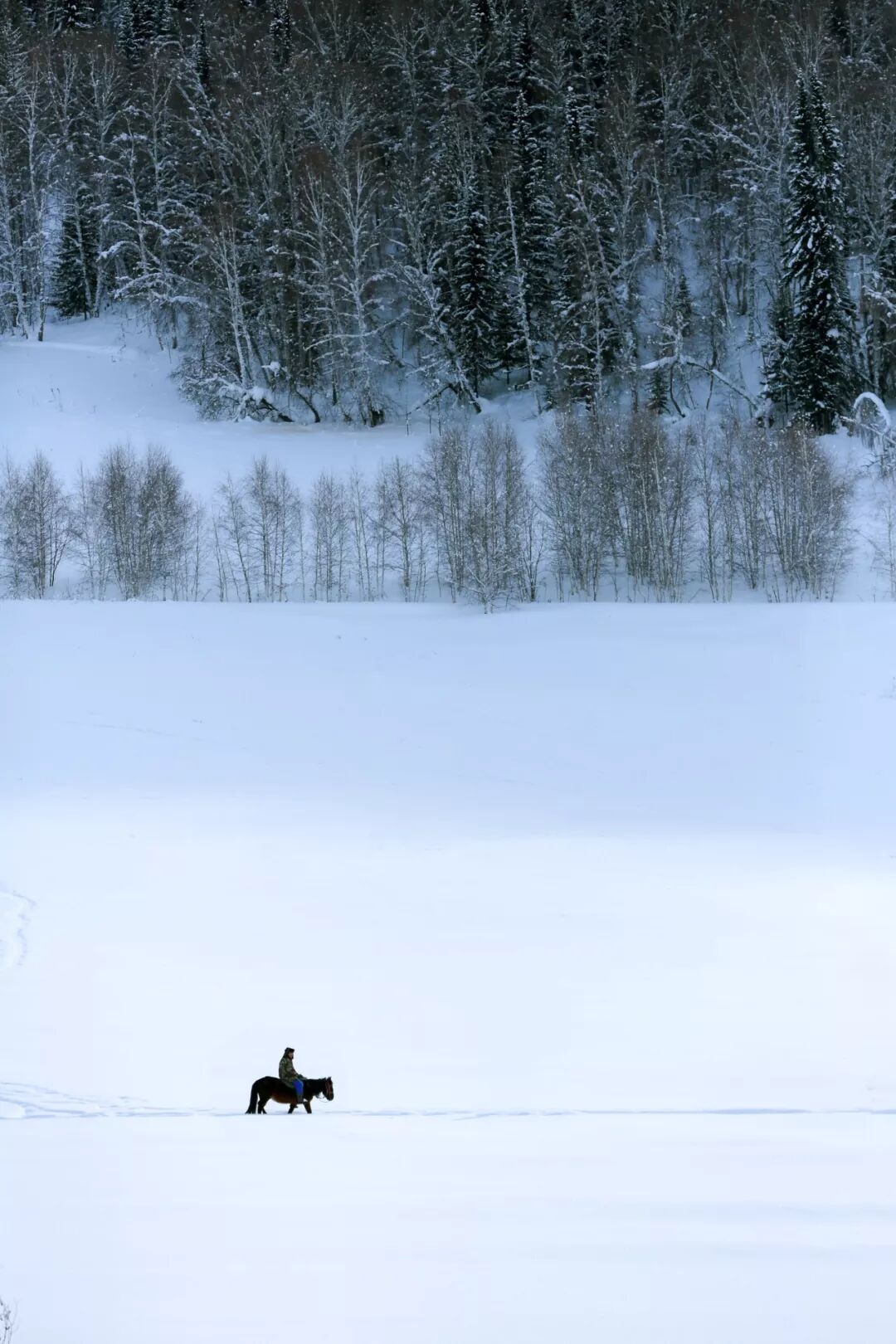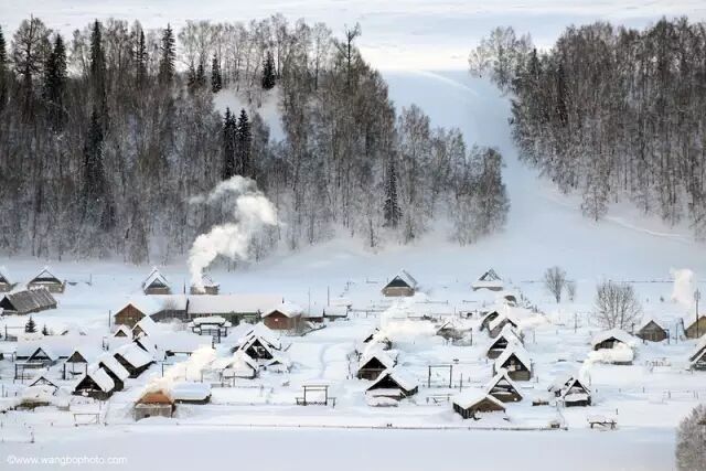 你可有想过冬季的喀纳斯吗?那时候再没有摩肩接踵的人群,满山的白桦树都披上银白色初冬的新雪,白雪皑皑的羣山像两条胳臂一样环抱着这里宁静的小村庄,也许寒冷的天气隔断了浮躁的人群,我认为冬天的喀纳斯才是真正的 " 神的自留地 " 。