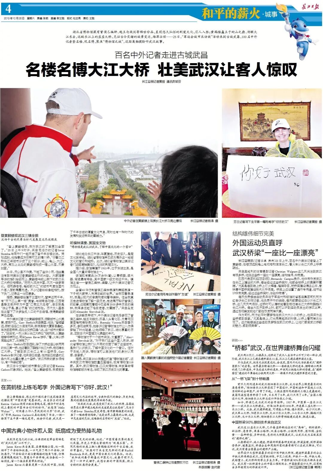 百名中外媒体记者昨日登上黄鹤楼,远眺龟山电视塔和长江,武汉长江大桥、鹦鹉洲长江大桥和杨泗港长江大桥尽入眼底。武汉桥梁让外国运动员印象深刻、直呼壮美:“一座比一座漂亮。”详见>>>