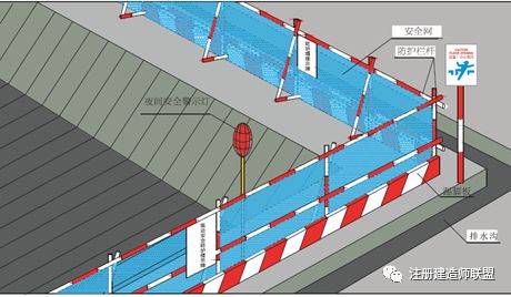 (1)基坑临边防护一般采用钢管搭设两道防护栏杆形式(防护栏杆应搭设三道,第一道栏杆离地1200mm,第二道栏杆离地700mm,第三道栏杆离地200mm。立杆高度1300mm,立杆与基坑边坡的距离不应小于1000mm。