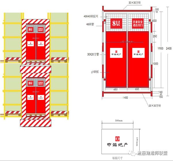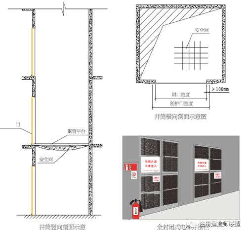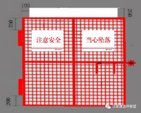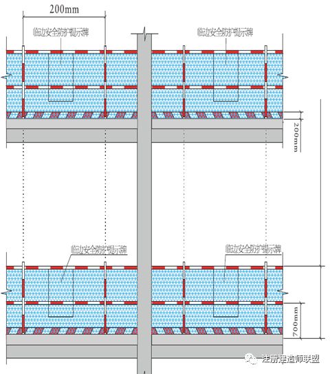 (1)对于剪力墙结构,楼层竖向洞口采用网片式防护,周边及横竖杆采用30*30mm方钢,其余为网片钢筋直径不小于2mm,网孔边长不大于20mm。