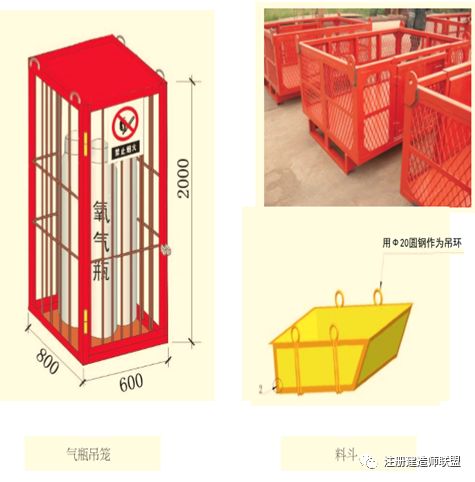 (1)气瓶吊笼:吊笼边框部分宜采用 45*45*5角钢焊接,围栏宜采用¢12mm圆钢焊接,吊笼的长未800mm,宽为600mm,高为200mm吊笼上部吊环使用¢20mm圆钢焊接牢固,顶部使用5mm厚度钢板封闭,吊笼应悬挂警示标牌(严禁烟火)、安全责任监督牌。