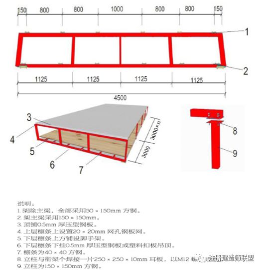 (2)衔梁主梁采用18号工字钢,上部焊接6个直径20mm钢筋,用以固定龙骨架。