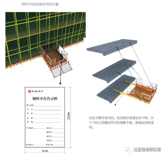 (4)在铺设楼层出入平台时,将木枋搁置在此门的下框上,并铺钉好模板,刷红白相间的警示色条纹。