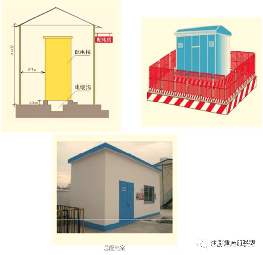 3、施工用电—总配电室(1)配电室应靠近电源,并设置在灰尘少、潮气少、无腐蚀介质及道路通畅的地方;配电室应能自然通风,并应采取防止雨雪侵入和动物进入的措施。