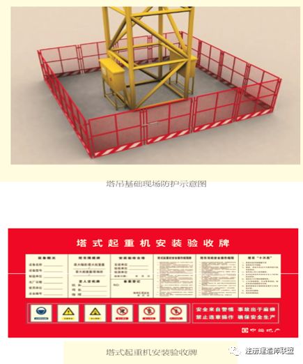 (2)塔吊基础不得积水,要有可靠的排水措施,在塔吊基础附近不得随意开挖。(3)塔吊基础四周必须设置1.8m高定型防护栏杆。塔吊安全使用告示应挂设在塔吊底部。