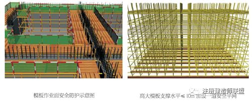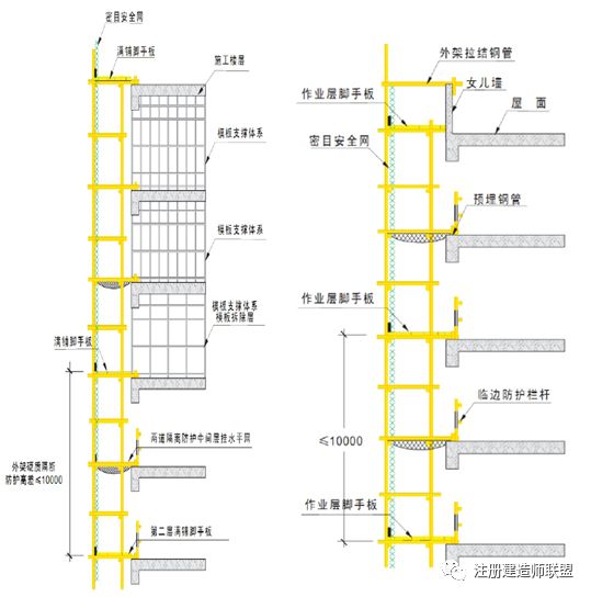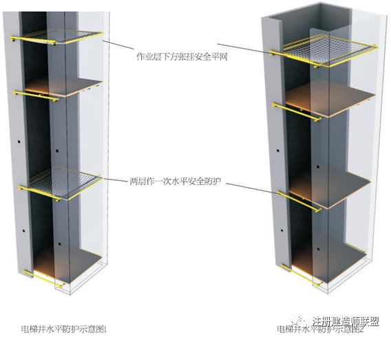 (2)电梯井内水平防护采用在井洞内每隔两层(≤10m)用钢管搭设防护平台,上面满铺跳板(主体施工阶段)或兜挂安全水平网(装修施工阶段)进行安全防护。