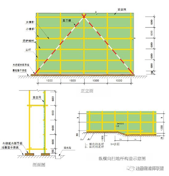 (4)脚手架立杆基础不在同一高度时,必须将高处的纵向扫地杆向地处延长两跨与杆固定,高低差不大1m,靠边坡上方的立杆轴线到边坡的距离不应小于500mm。