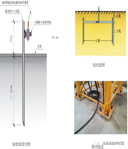 (4)保护零线必须采用绿/黄双色线,不得采用其他线色取代。塔吊等大型设备的接地体引出扁钢应采用螺栓将其与标准节连接,不得将引出扁钢焊接在标准节上破坏塔吊主体结构。