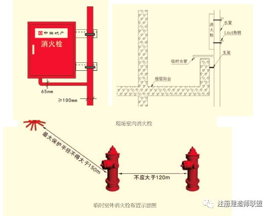 (3)消防栓的间距不应大于120m,最大保护半径不得大于150m,且与在建工地、临时用房和可燃材料堆场及其加工场的外边线的距离不应小于5m。给水干管的管径不应小于DN100.
