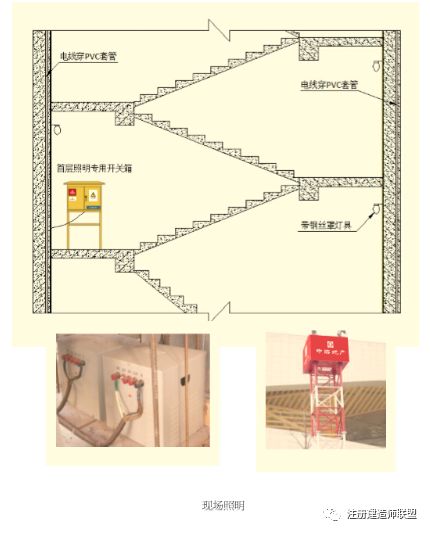 (5)照明灯具的金属外壳必须与PE线相连、照明开关箱内必须设置隔离开关,短路与过载保护器和漏电保护。