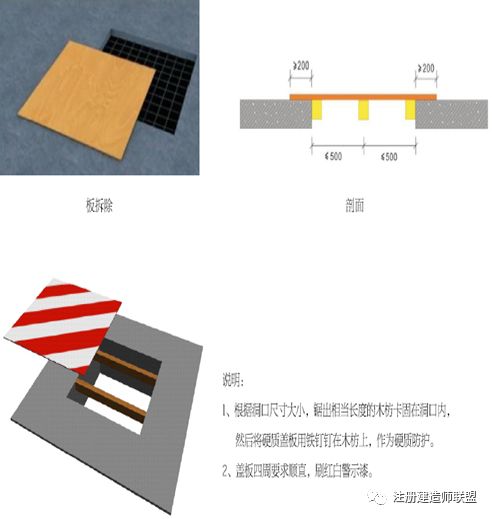 (2)模板拆除后,在洞口上部采用硬质材质材料封闭,并穿孔用铁丝绑扎与预留钢筋上,以固定,