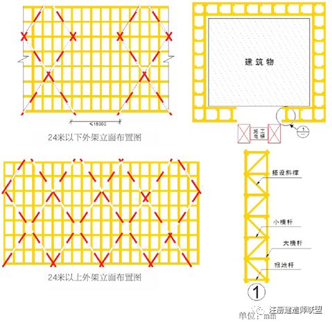 (2)24米以下的外架,在架体外侧两端、转角及中间间隔不超过15m的立面上设置剪刀撑。24米以上的外架,在架体外侧搭设连续剪刀撑。