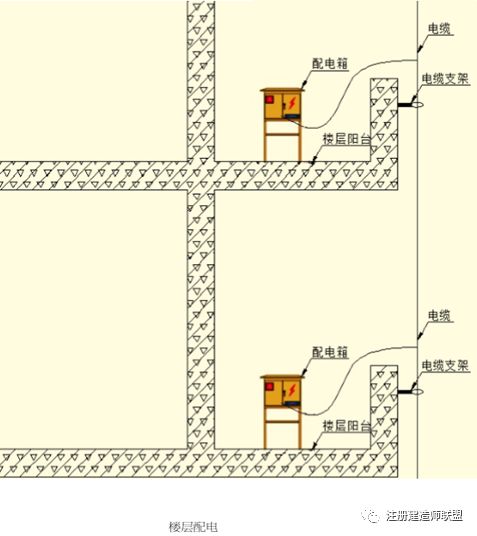 (1)楼层分配电中,电缆垂直敷设在外墙阳台位置,各楼层分配电箱放置于阳台位置。
