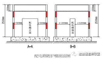 (2)在防护棚正面可悬挂操作规程牌,警示牌及电工人员姓名和电话,侧面挂安全标语:加强安全用电,防止触电伤害。