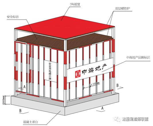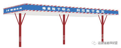 (9)龙骨外用900mm高硬质模板封闭,长边外贴标语:责任心是安全之魂 标准化是安全之本/隐患险于明火防范胜于救灾。短边外贴X号钢筋加工棚,标语上下边分别采用100mm高的红白相间的警示色条纹。