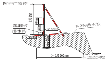 (2)防护栏杆内侧满挂密目安全网,防护外侧设置200mm高踢脚板。防护栏杆和踢脚板刷红白相间安全警戒色。