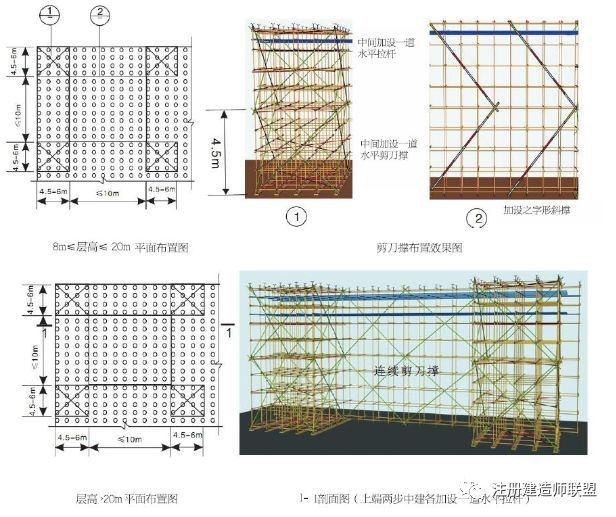 (3)一字型、开口型双排架两断口必须设置横向斜撑,24米以上架体咋架体拐角处及中间每六跨设置一道搭接斜撑。