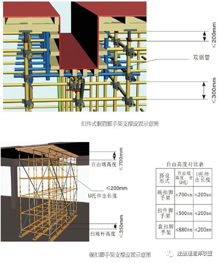(2)主体结构施工期间,在墙内预留180*180方孔,采用2根16#工字钢作为操作架支撑。分段搭设分段悬挑,架体膏体不大于20m,步距不大于1.6m。