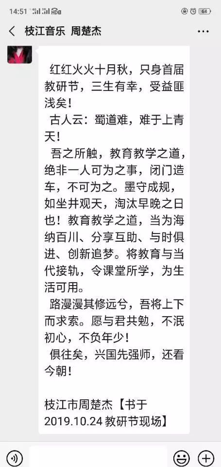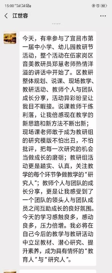 秉承育人首位,乐在经验分享。宜昌首届中小学体音美教研节如火如荼的开展,聆听伍家区各位老师精彩的学科分享,满载而归。这次学习看到怀揣教育情怀的老师,更看到了教研成果。让学生成为课堂主角,紧随教研团队,创新与传统碰撞,雅致与科技交流,精彩纷呈中学到了坚持、团结、仁爱。今后我将不忘初心,砥砺前行,克服困难,播种思维和习惯,让核心素养在课堂真正落地生根。