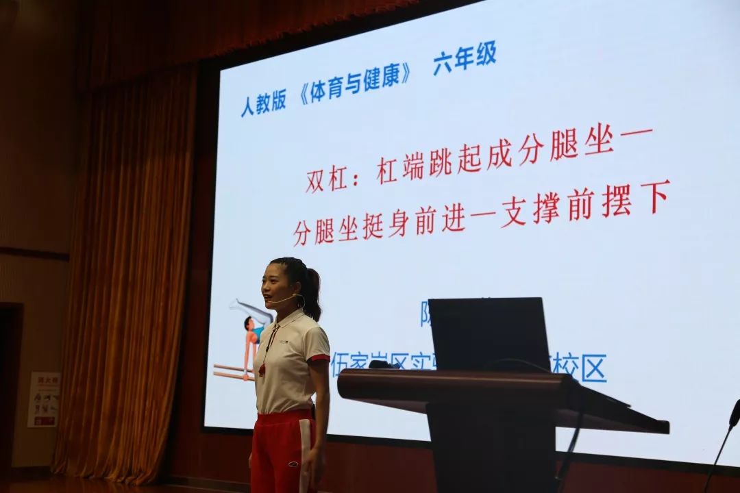 伍家岗区宝塔河小学卢大敏老师、中南路小学陈群老师分别就五年级武术《五步拳》和六年级《双杠:杠端跳起成分腿坐—分腿坐挺身前进—后摆转体180度成分腿坐—支撑前摆下》进行了现场说课和模拟上课展示,伍家岗小学邓小玲老师和花艳小学黄毅老师分别就四年级《篮球—行进间运球》和五年级《跨越式跳高》进行了现场教学展示,从不同的角度展示了伍家体育教学研究的深度、广度和精度,展现了伍家体育教育人的熠熠风采。