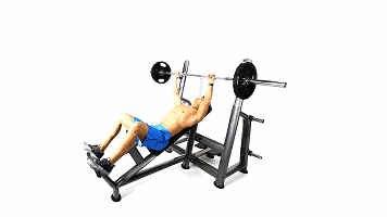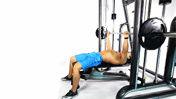 2.当杠铃推起至两臂伸直时(或保持肘部一定小角度时),必须使胸大肌处于“顶峰收缩”状态,稍停。