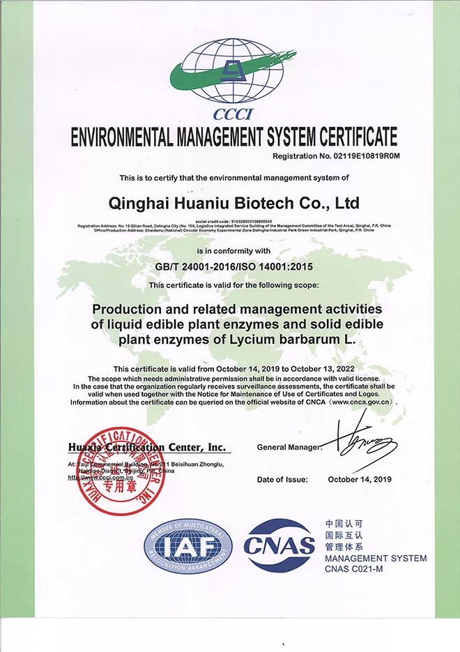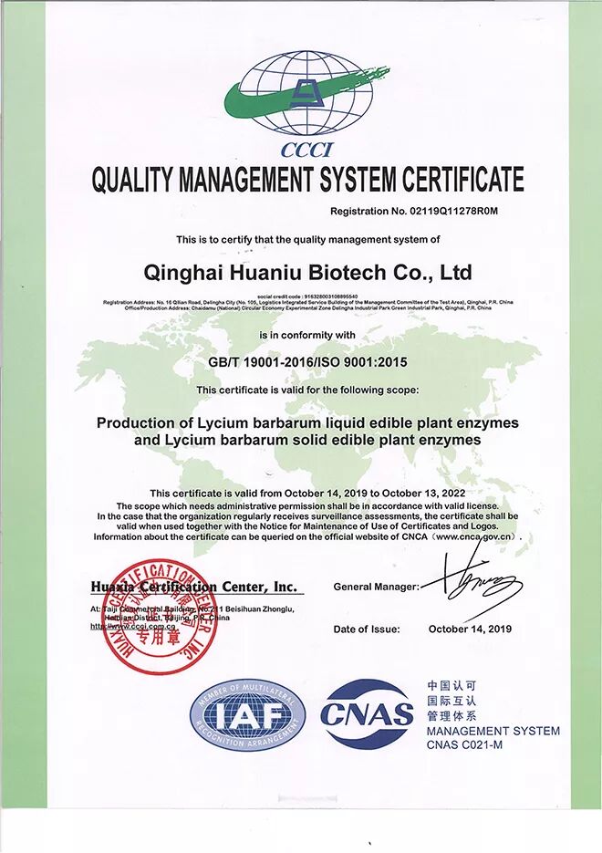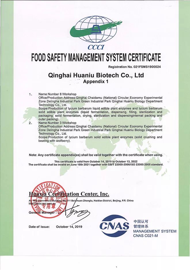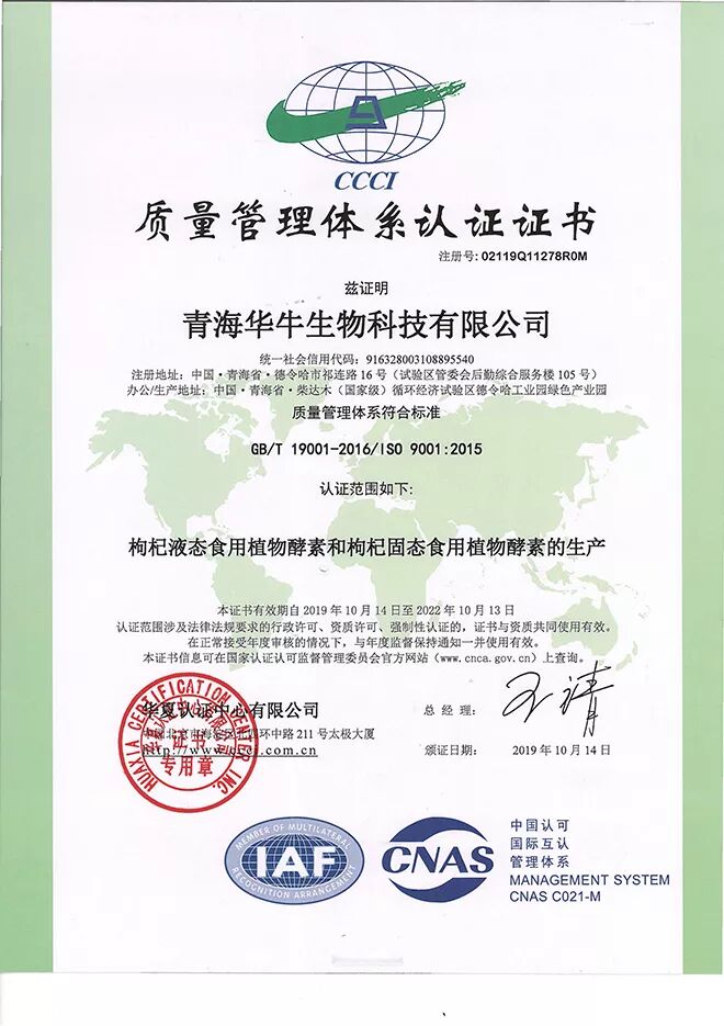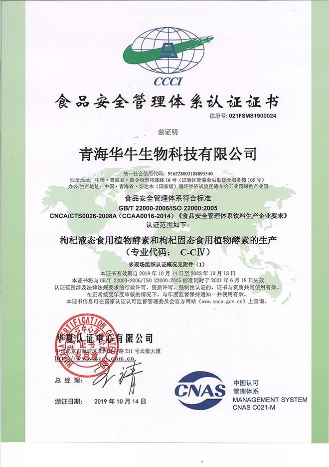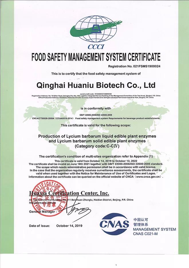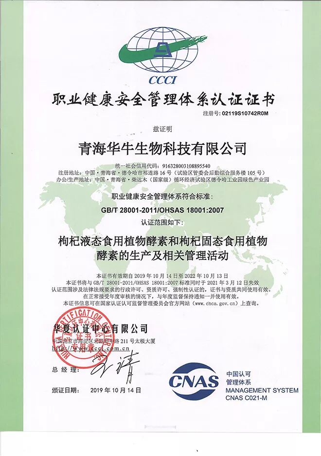 青海华牛生物科技有限公司自成立以来,严格依照国家对食品企业的相关管理规范、标准开展工作,落实质量管理体系要求(GB/T19001-2016/ISO 9001:2015),为消费者提供高品质的枸杞固体和液体酵素产品,落实环境管理体系要求(GB/T24001-2016/ISO 14001:2015),建设环境友好可持续发展的食品加工企业,落实食品安全管理体系要求(GB/T22000-2006/ISO 22000:2005),为消费者提供安全健康的枸杞酵素产品,落实职业健康安全管理体系(GB/T 28001-2011/OHSAS 18001:2007),有效控制职业健康安全风险,确保从业和相关人员健康。