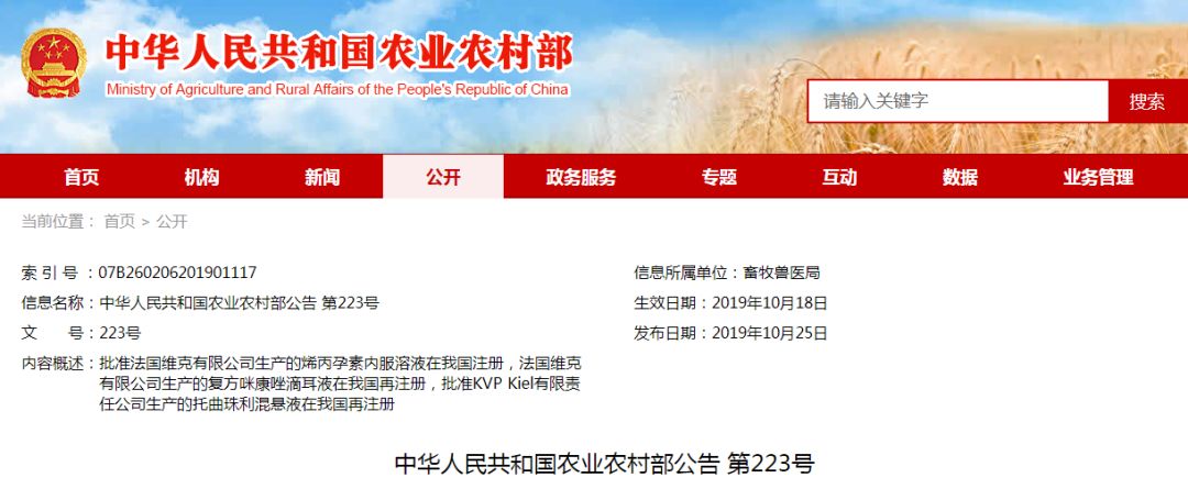 根据《兽药管理条例》和《兽药注册办法》规定,经审查,批准法国维克有限公司生产的烯丙孕素内服溶液在我国注册,核发《进口兽药注册证书》,并发布产品质量标准、说明书和标签,自发布之日起执行。