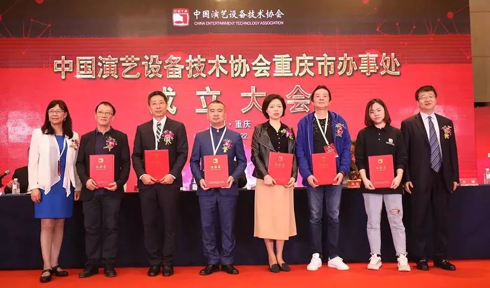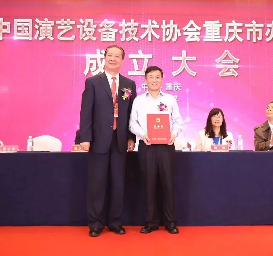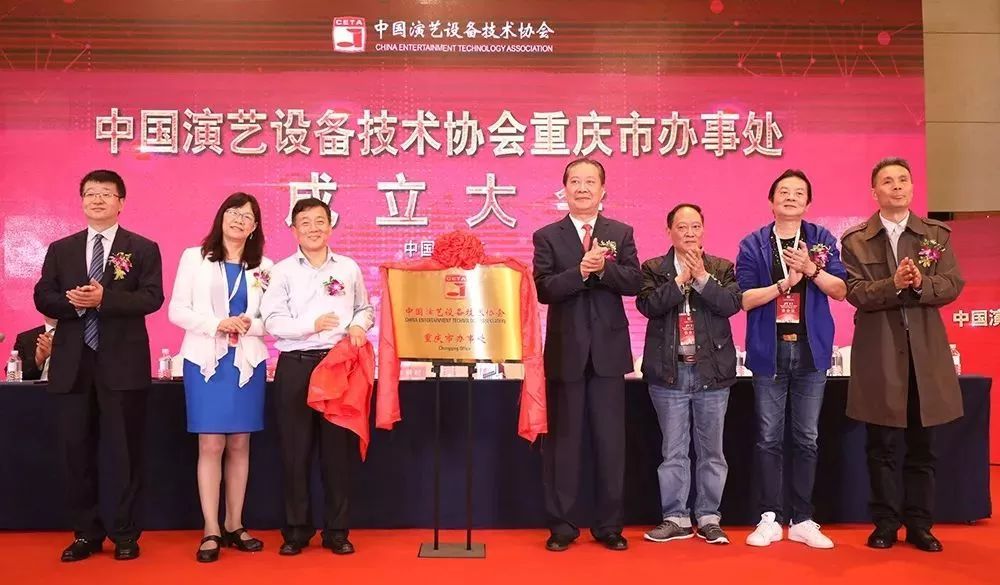 颁发证书仪式过后,在现场将近300位来宾的见证下朱新村、潘志忠及主席台嘉宾共同为办事处揭牌,也宣告着中国演艺设备技术协会重庆市办事处正式成立。