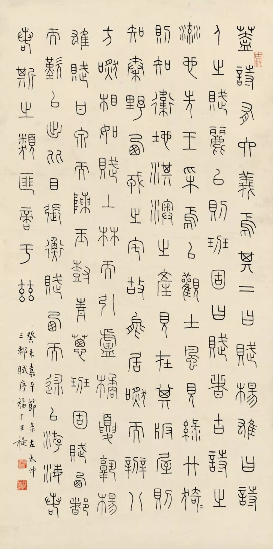 释文:盖诗有六义焉, 其二曰赋。 杨雄曰: 『诗人之赋丽以则。 』 班固曰: 『赋者,古诗之流也。』。先王采焉,以观土风。见『绿竹猗猗』,则知卫地淇澳之产;见『在其版屋』,则知秦野西戎之宅。故能居然而辨八方。然相如赋 《上林》 而引 『卢橘夏熟』 , 杨雄赋 《甘泉》 而陈 『玉树青葱』,班固赋《西都》而叹以『出比目』,张衡赋《西[京]》而述以『游海若』。若斯之类,匪啻于兹。癸未嘉平,节录左太冲《三都赋序》。福厂王禔。