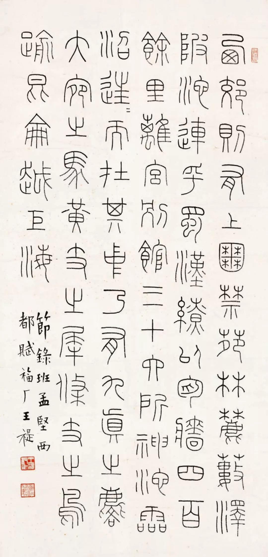 『铁线篆』是小篆书体的一种,因线条纤细盘屈、韧如铁丝而得名。擅此种书体者,历代名家有唐之李阳冰,清之王澍、洪亮吉孙星衍等。至民国,当推王福厂为一时之翘楚,后世学铁线篆书者多师法之。
