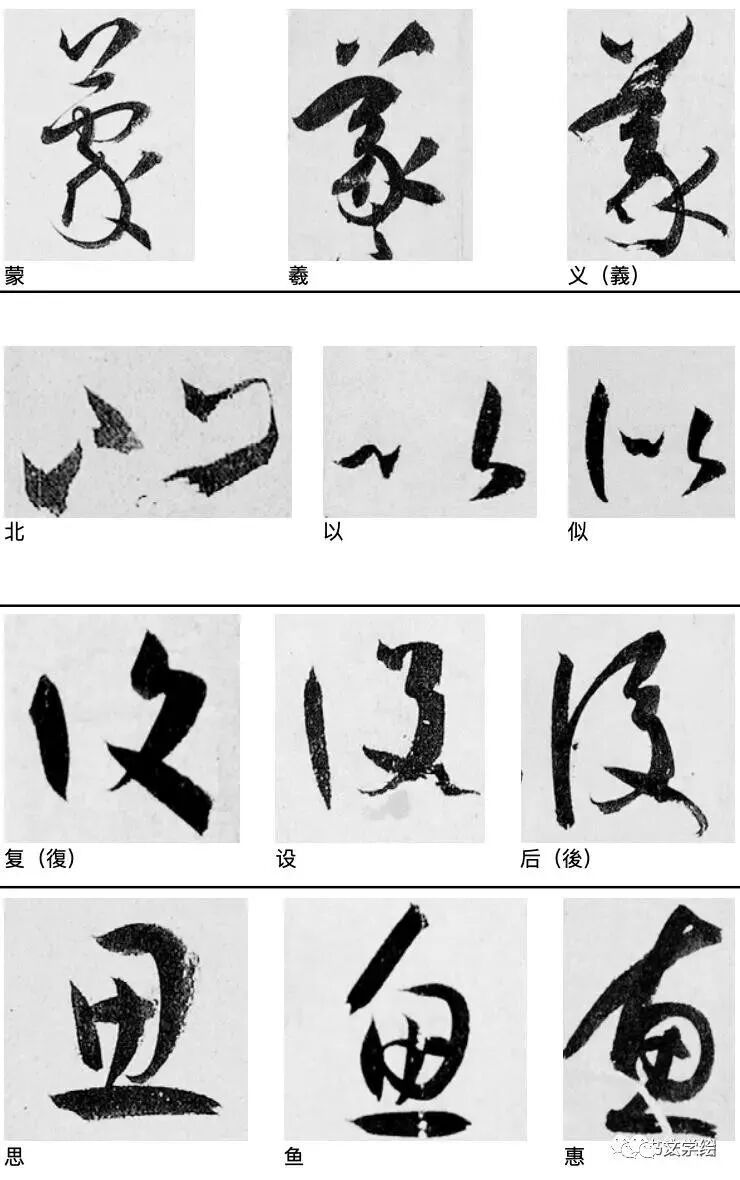 由于草书是汉字的缩写,是人们长期使用后形成的,所以草书没有固定的简化原则。我们会发现,草书中有许多不同的字,其外观非常相似,而区别只在于个别的点的书写。为了避免你的错误,在这里我们找出一些有代表性的形状相近的字符,供你识别、练习。