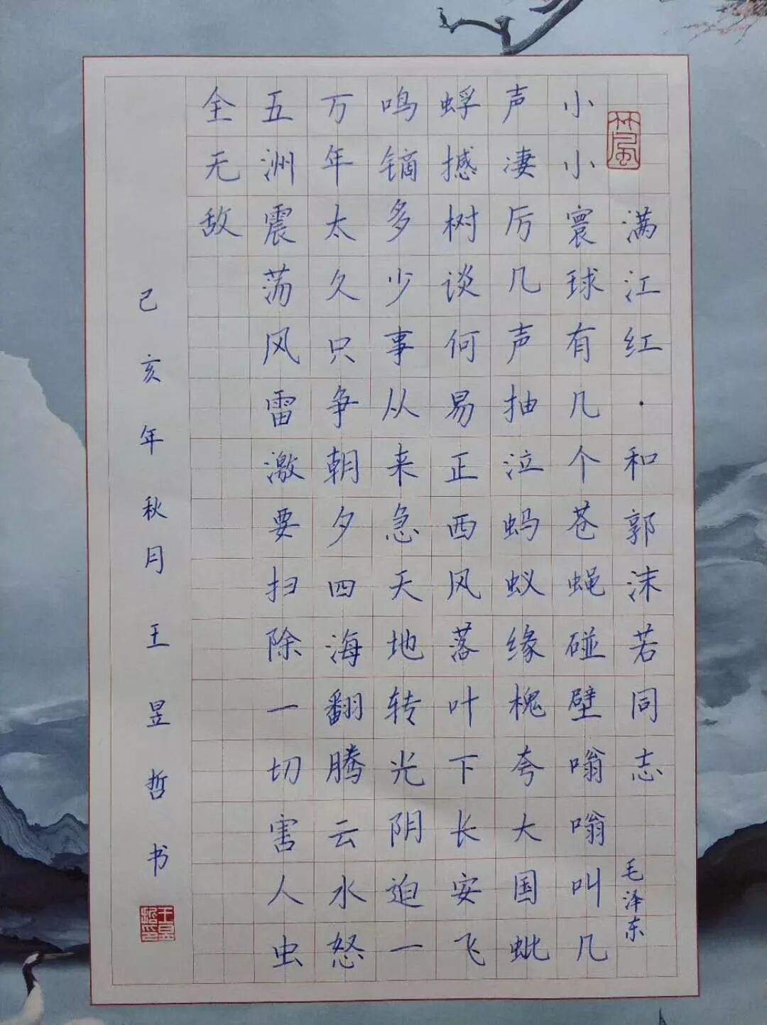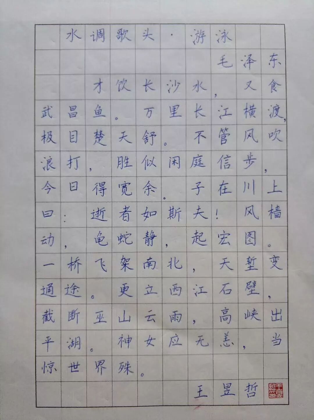 王昱哲同学最开始从硬笔开始学习,在硬笔上初见成效喜欢上了软笔,软笔的字形结构帮助你对于硬笔的字形结构有了更深的理解,在你软硬兼修的时候,软硬笔有了非常明显的进步,到现在能够自己独立写出作品并写得很棒,都离不开你的软笔学习。