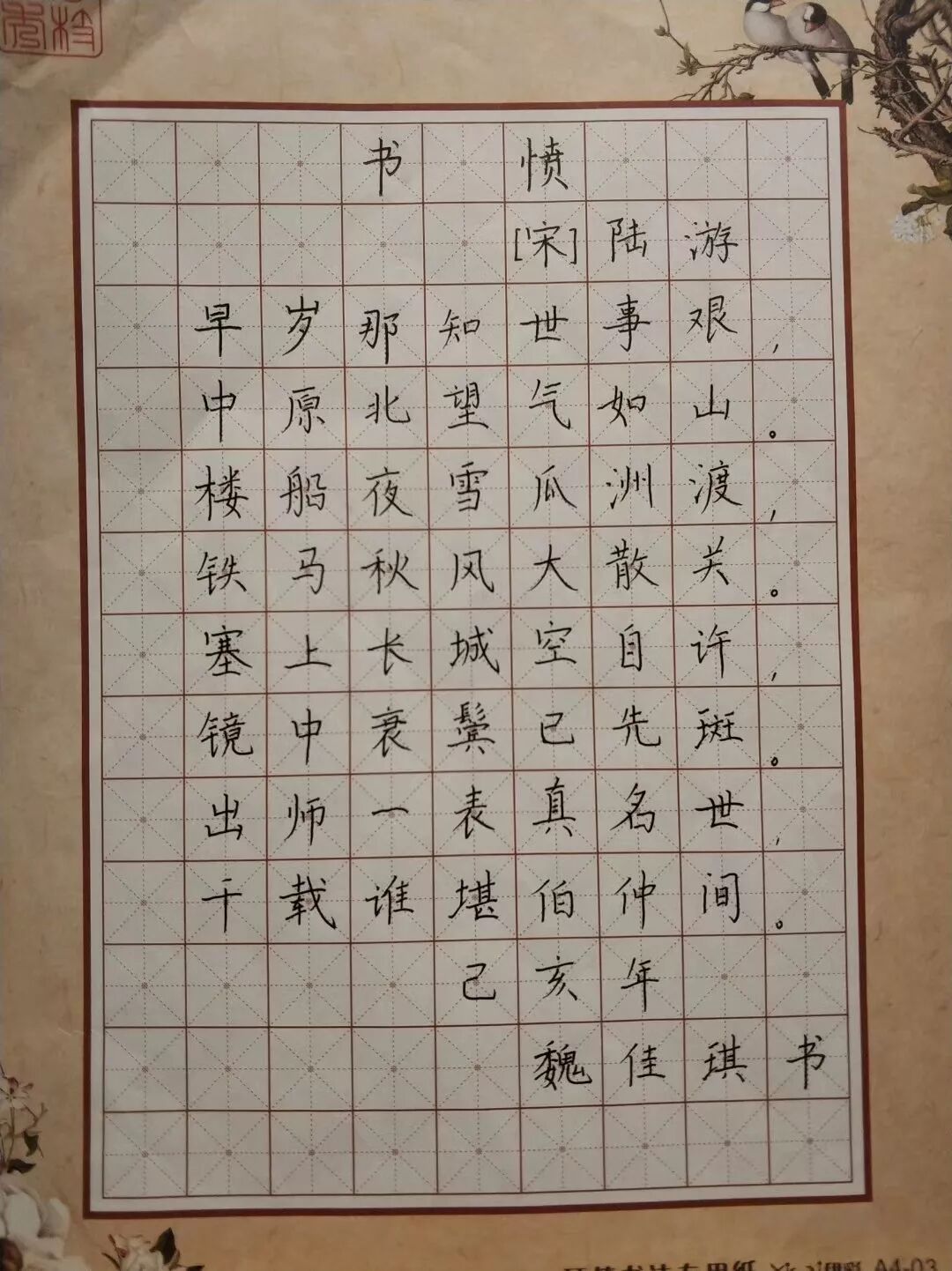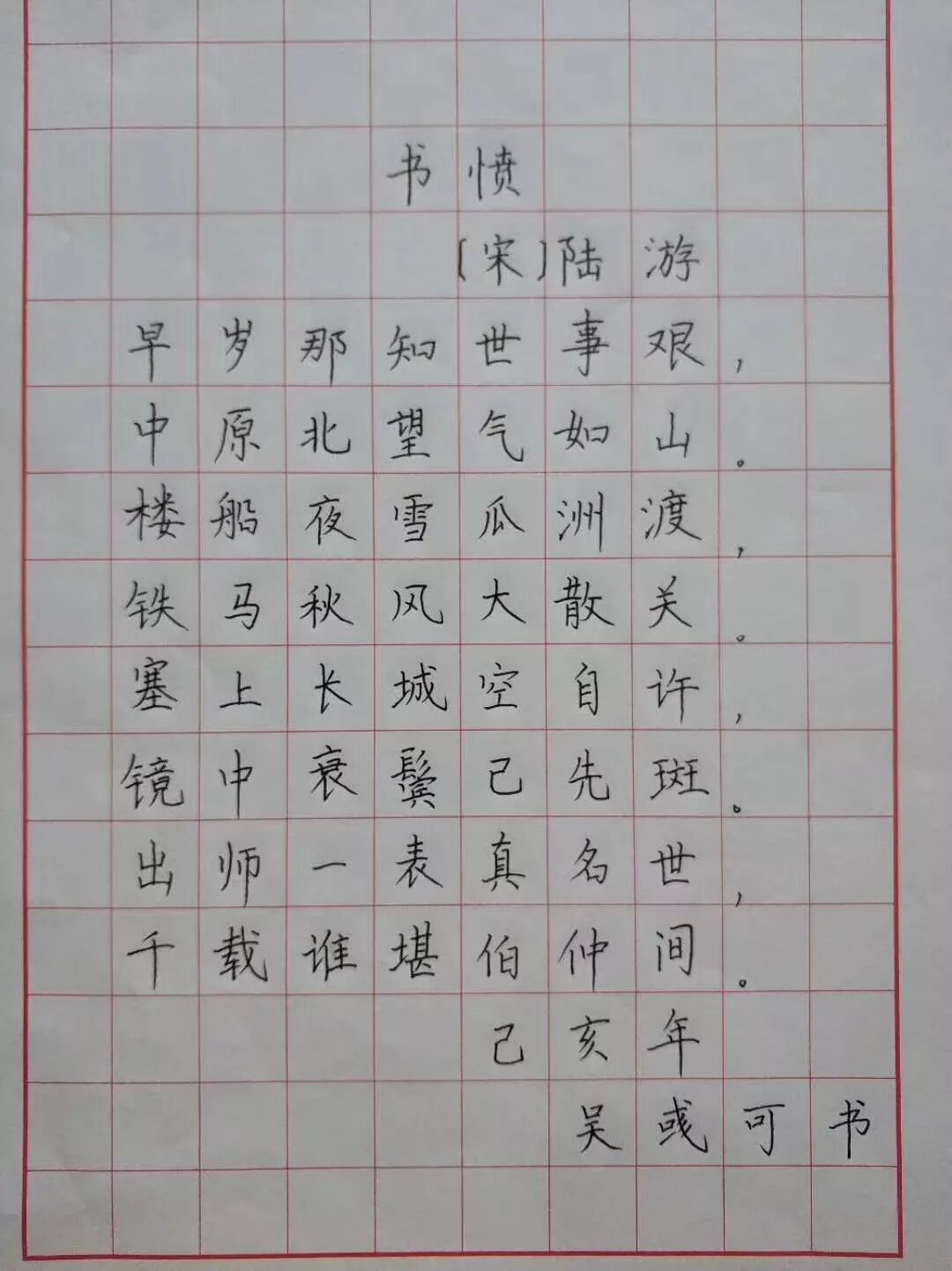 吴彧可同学的字形有比较明显的颜体字形,深受软笔学习的影响,你所有的作品都干净,清雅,看得出软硬兼修得很好并且有优秀的书写习惯和自我管理能力。看着你从零基础到现在掌握楷隶两种字体,归功于这三年多的学习,从未有超过一个月的中断,你的坚持造就你的一手好字。