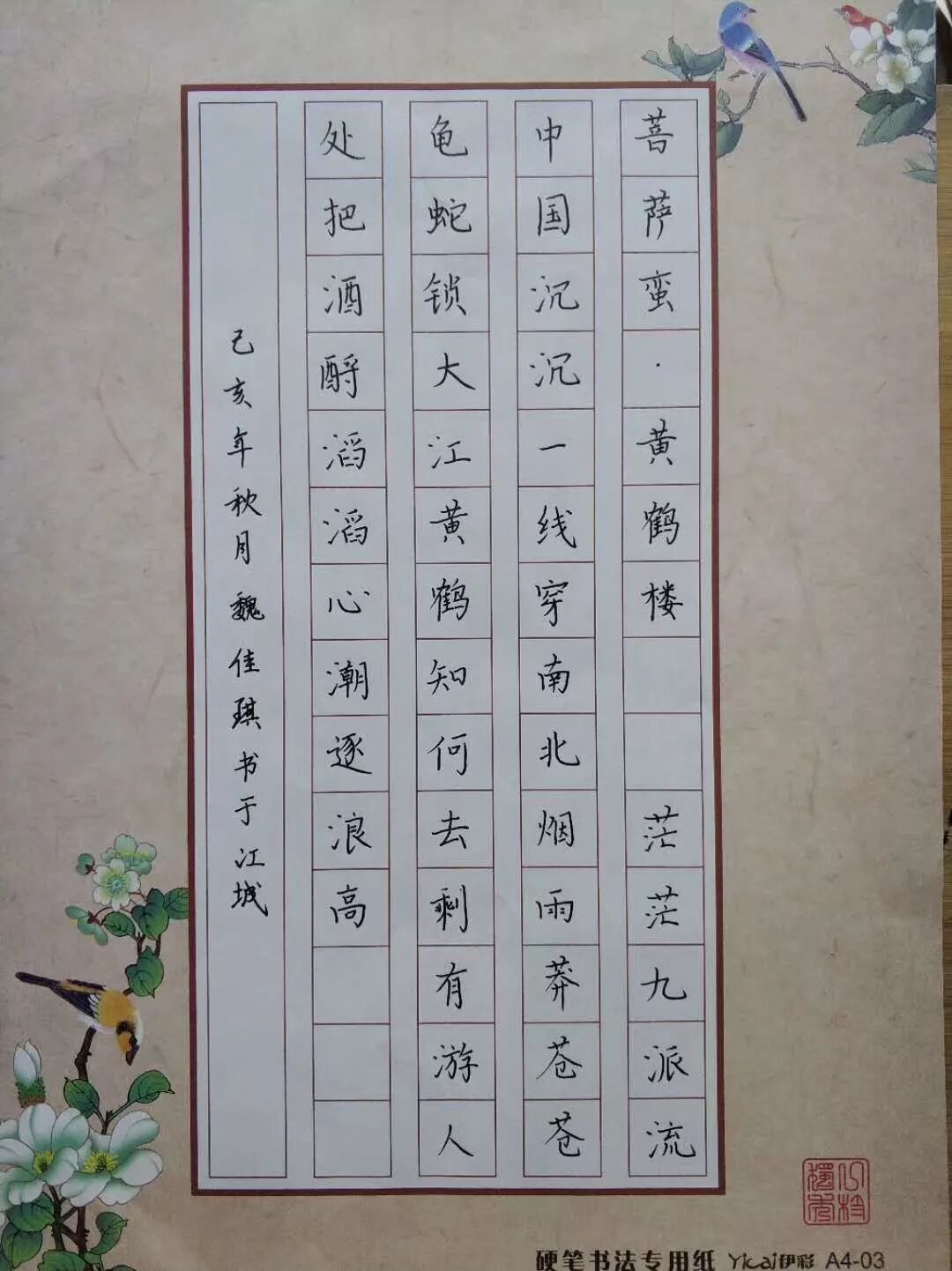 魏佳琪同学作品笔画线条很有灵性,落款写的行楷书彰显了你的能力,在书法中有正文不足款来补的说法,你的落款给你的作品加分不少,但仍要注意布置每个字的大小保持一致。