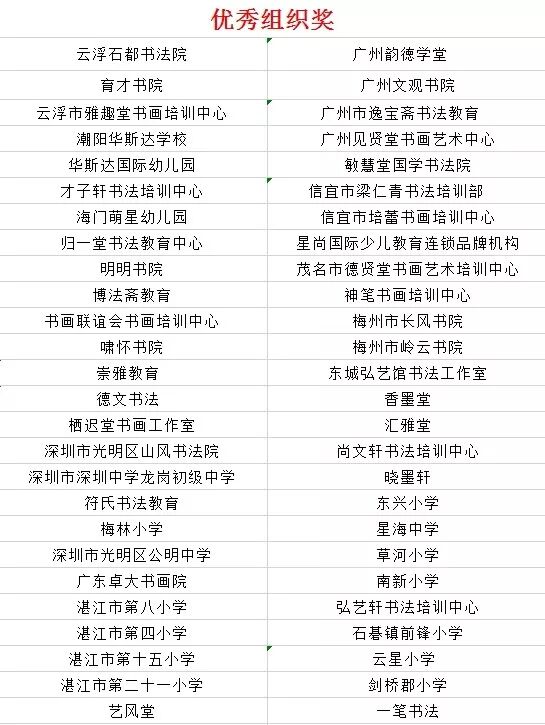 经仔细审核参赛投稿名单,现将书法教育名师、优秀指导老师、示范赛区优秀组织单位获奖结果公示如下: