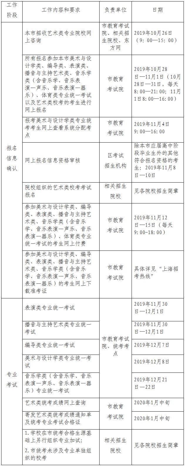 2020年上海市普通高校艺术类专业报名考试工作日程表