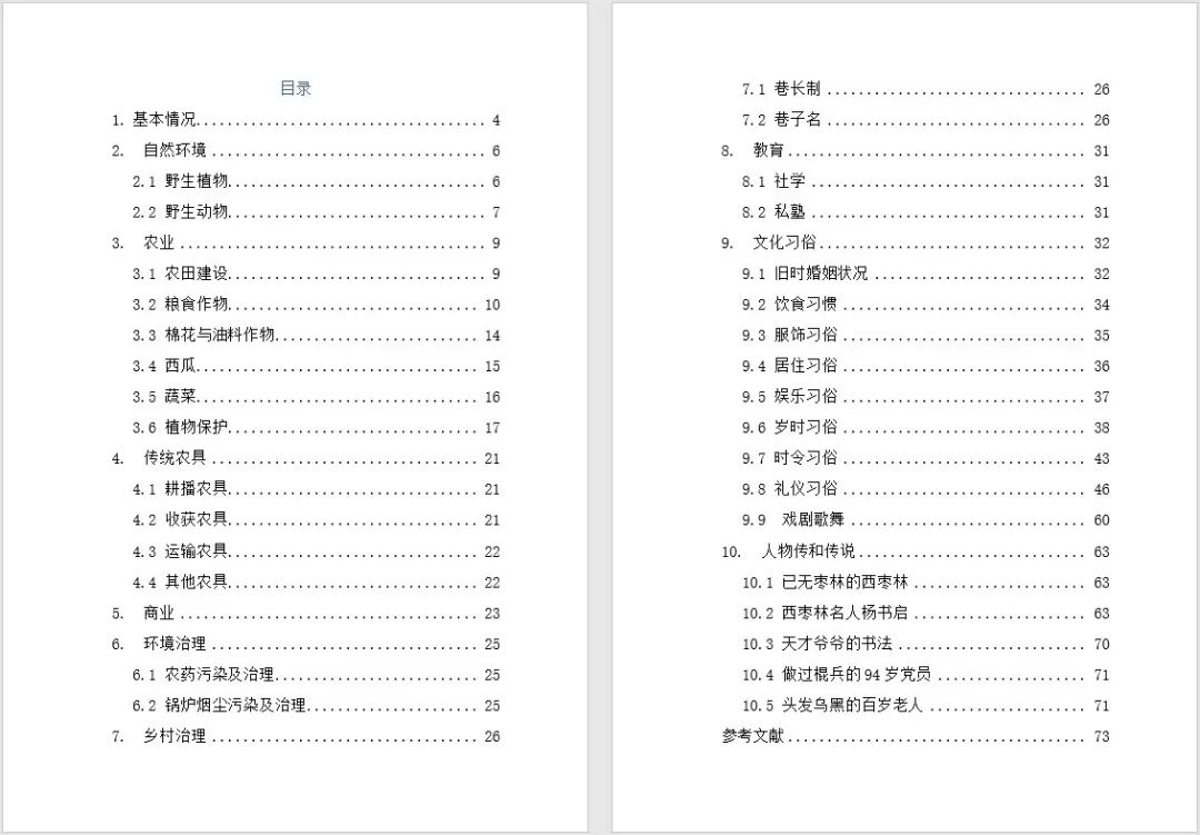 《西枣林村村史村志》参考了《大兴县志》,完成包括村庄基本情况、自然环境、农业、传统农具、商业、环境治理、乡村治理、教育、文化习俗、人物传和传说等十章内容,共计35173个字。通过编修村志,全面、系统地记载社区的历史和现状,留下一份政治、经济、文化、生活、习俗的村民、村事实录,为后人保存一份珍贵历史资料,其“存史”价值随时代推进将会显现。