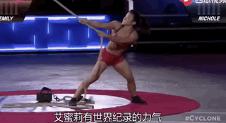 两位肌肉女生,徒手拉着绑着铁球的绳,制造狂暴气旋,撞向直立的铁柱子,谁在规定时间,最快将5颗柱子撞倒,谁获胜。