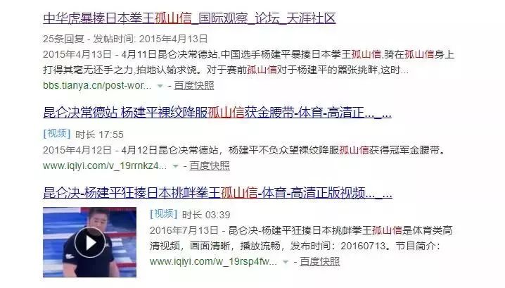 在外网上搜索孤山信的相关信息,只能找到一个没有照片的网页,页面显示他唯一的战绩就是输给了杨建平,是一位历史战绩0胜1负的“最强空手道”。