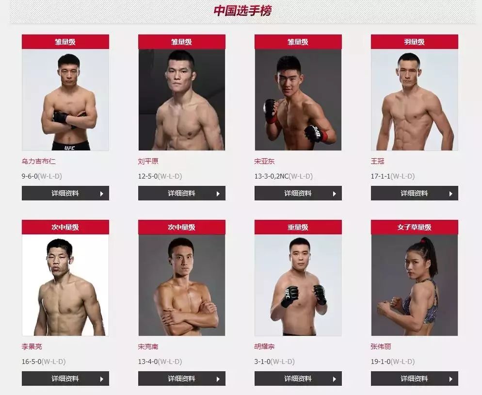 此外,尤其值得一提的是中国女选手张伟丽,她目前的排名为世界第五,如果能在今年8与31日对阵安德拉德的比赛中取胜,她将成为中国第一个UFC世界冠军。