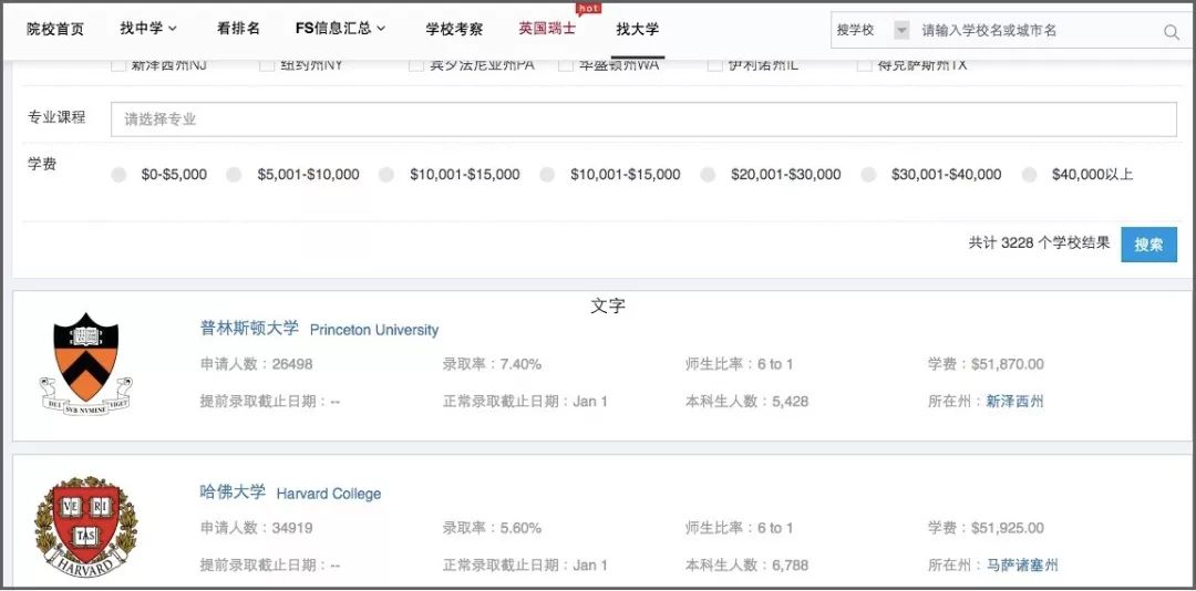即可按照大学名称、地域、专业、学费等属性,搜索您感兴趣的美本。